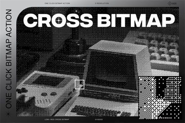 交叉位图是一种 Photoshop 动作,可将您的图像转换为交叉像素位图效果。创造复古未来主义风格很好。它可用于制作 8 位、点状图像和噪声效果。对于不同尺寸的图像,它有 3 种分辨率变化。