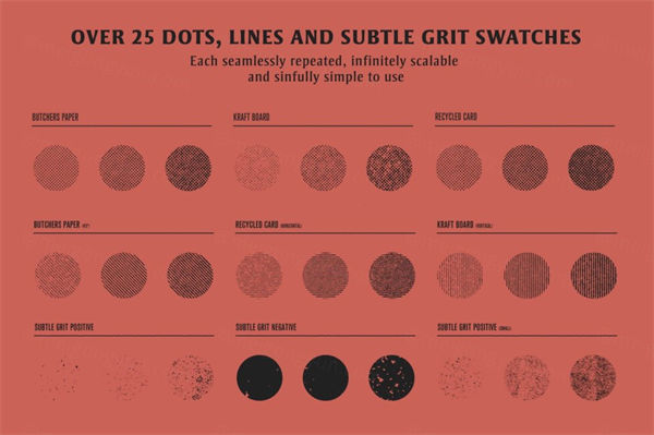 每个无缝图案均由真实世界的纸张纹理制成,并无休止地重复。使用您选择的纹理填充任何形状,或使用画笔或斑点画笔工具绘制纹理。使用图案选项调色板快速轻松地更改色板颜色。