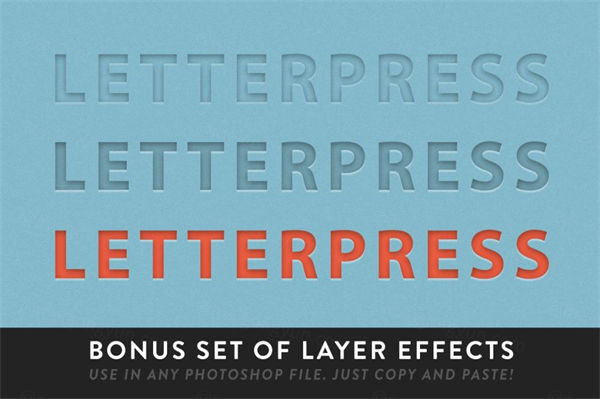 此外,当您立即购买时,您将获得 LetterPress 图层样式作为免费奖励。这是一个单独的文件,允许您在没有 RetroSupply LetterPress 文件的任何工作中轻松使用 LetterPress 效果。简单的右键单击,复制图层样式,然后将图层样式粘贴到任何Photoshop文件中的任何图层中。