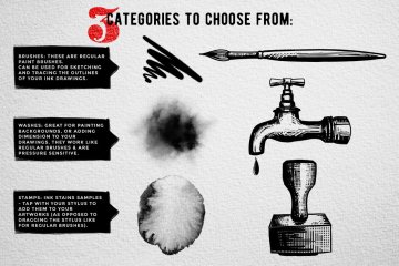 这是适用于 iPad 应用程序 Procreate 的一套 36 个手工墨刷!该套装分为 3 个不同的类别:普通刷子(用于墨水素描)、墨水洗涤和墨水污渍图章。(有关包含的所有画笔的预览,请参阅色板图片)。