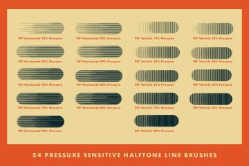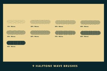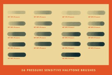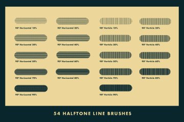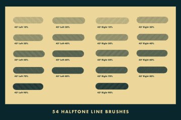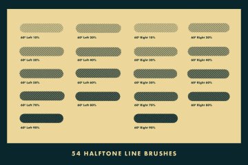 53 种标准半色调画笔,包括各种色调 (10-90%) 和标准半色调、粗半色调、线条和波浪线。