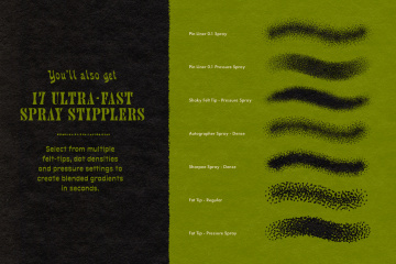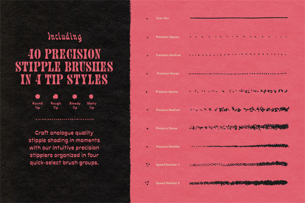 每个精确的画笔组都包含多个带有匹配笔尖和衬里的预设,随时可以处理任何点画任务,从微妙的边缘阴影到大的混合渐变和淡化。