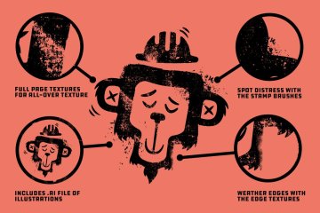 1. Illustrator 中的纹理作品。使用全页、轻量级、灰度 PNG、画笔和边缘纹理,在 Illustrator 中为您的打印作品添加自然、粗糙、坚韧的纹理。只需放置在您的工作上,选择您想要的颜色,您就可以开展业务了。