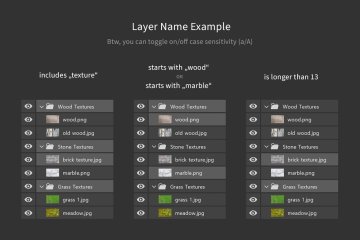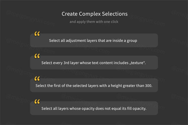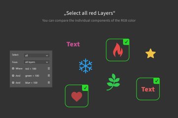 您是否曾经想根据特定标准选择一组图层?使用智能选择,您可以定义图层应满足的任何条件,然后自动执行选择它们的过程。该插件提供了完全的自由度和可定制性,因此您可以准确定义您需要的逻辑!以下是一些示例: