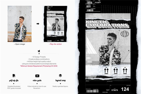 Supreme Kinetic Scan Photoshop 动作为您生成十二种不同的布局预设。