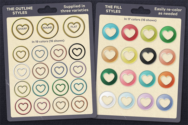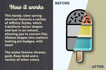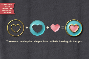 这个方便、省时的快捷方式具有多种 Affinity 样式,可立即转换矢量形状和文本,让您轻松将扁平、毫无生气的形状转换为逼真的别针徽章,赋予它们标志性的 3D 珐琅外观!看看我创建的示例,看看即使是简单的形状也能变成看起来真实的别针徽章。