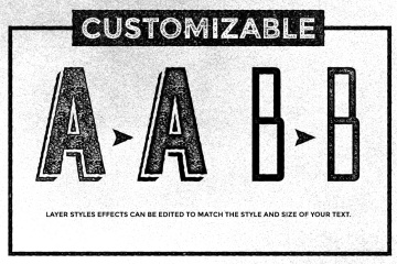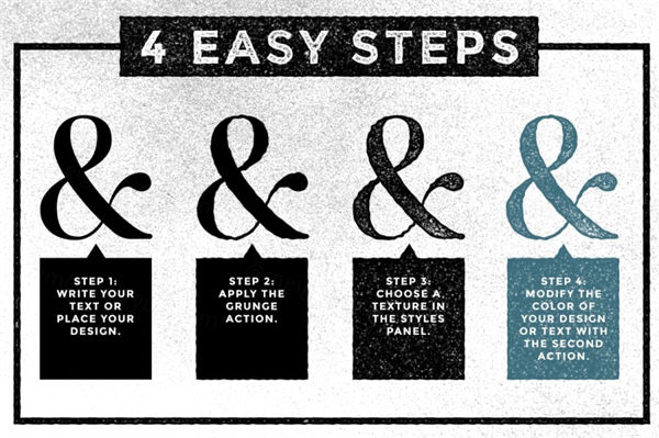 该集合包含 12 种具有不同纹理的单独图层样式、1 个用于创建不规则边缘的垃圾动作(此动作有三个版本 - 细微、中等和大,取决于字体大小和样式)和颜色动作。