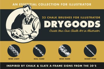 DryGoods 套装为您配备 23 个粉笔 Illustrator 画笔。这些画笔是通过使用各种不同的粉笔创建的。每个都有不同程度的磨损(为您的工作提供最大的多样性)