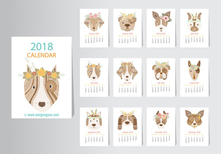 图穷联素材库 » 卡通手绘狗年日历台历矢量模板 MGY-7