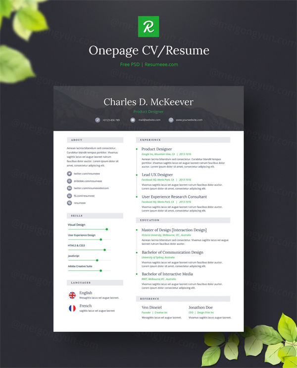 使用Resumeee.com发布的免费赠品,创建一个具有最小布局的单页简历模板。它可以被任何人用于任何类型的工作。免费赠品是完全分层的,带有可定制的元素,这些元素被相应地组织和命名。