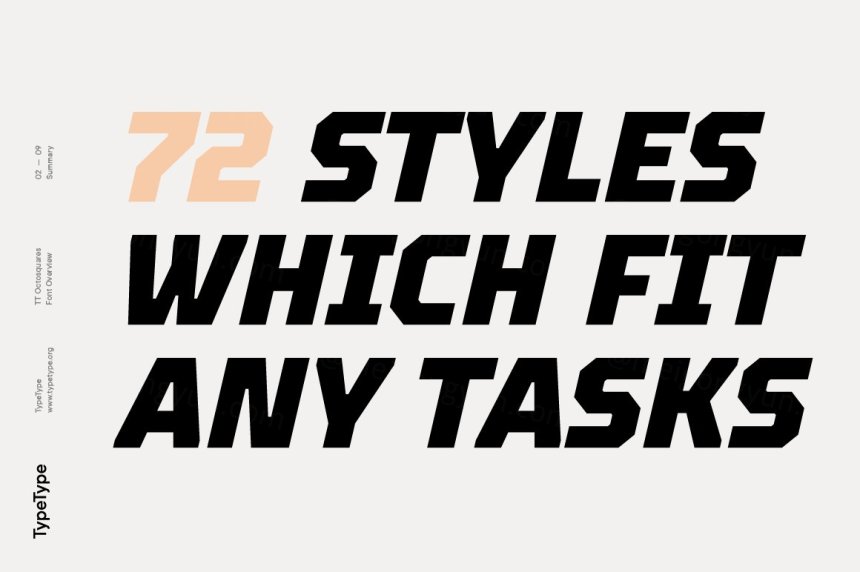 TT Octosquares 是我们第一个商业字体 TT Squares 及其窄版 TT Squares Condensed 的全新、修订、扩展和显着改进的版本。由于我们对原始字体系列的热爱,感觉缺乏功能、字符组成、特性和设计新鲜度,这促使我们产生了完全重启的想法。现在 TT Octosquares 可以安全地称为由 4 个宽度(压缩、压缩、标准、扩展)、72 个面(每个宽度 18 个)组成的超家族。