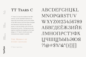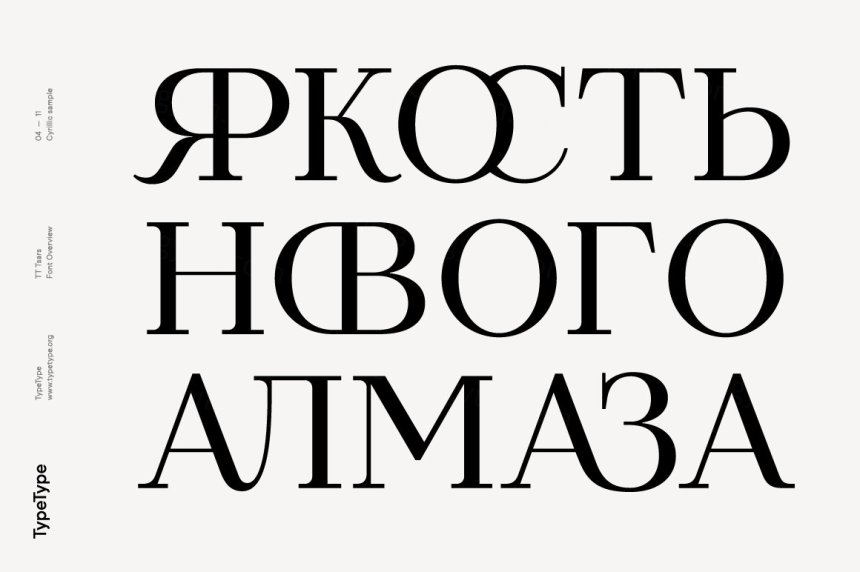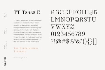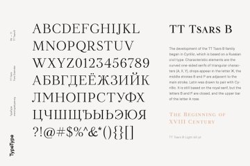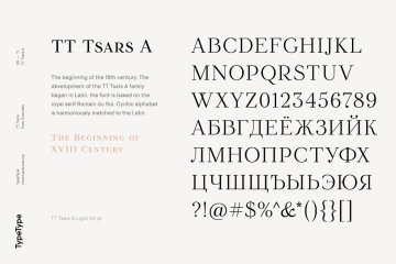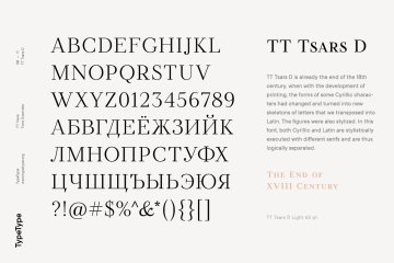 TT Tsars 字体系列是一系列衬线显示标题字体,其风格化为类似于十八世纪初期、中期和末期的字体。该项目基于标题字体,即用于设计书籍标题页的字体。TT Tsars 项目的想法是在对西里尔字体的历史发展进行小型研究后诞生的,也是基于 Abram Shchitsgal 的《俄罗斯民用字体》一书。