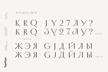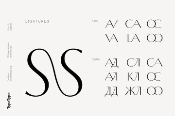 字体的主要视觉特征是其多样性和使用不同风格集完全改变字体特征和感知的能力。正版人物刻画严谨,字体显得严肃,仿佛字体中的铭文真的是用石头雕刻的一样。在另一组的帮助下,我们可以为字体添加圆度,甚至平滑度。这是因为第二组中的字母(拉丁语中的 ERKQJY 和西里尔语中的 Л К Ж Э)要么具有非常明显的“卷曲”,要么具有光滑、圆润的“腿”。此外,字体包括一组漂亮的连字,用于显示铭文,例如大标题。