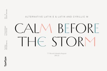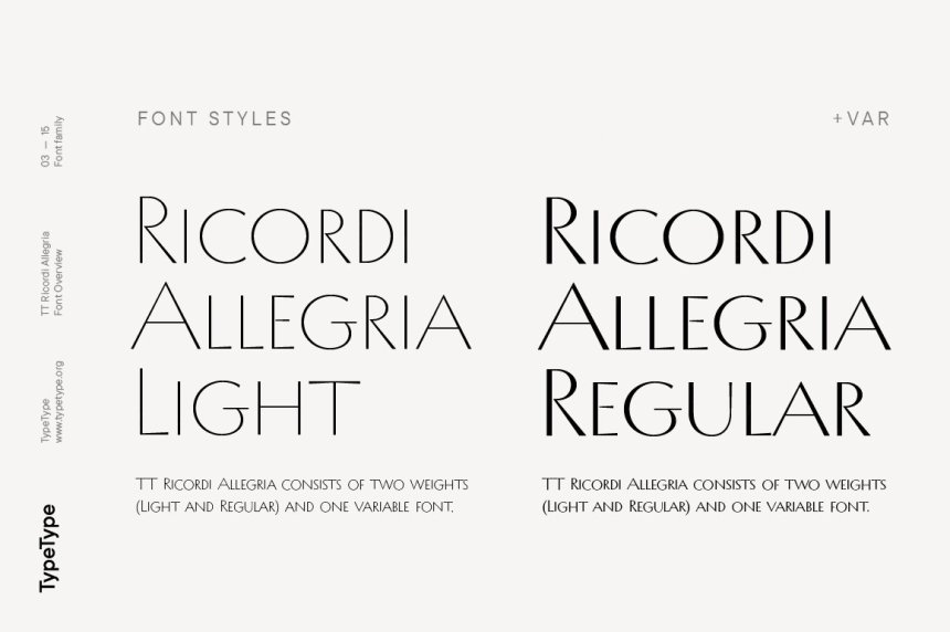 TT Ricordi Allegria 是一个时尚而聪明的当代佛罗伦萨怪诞作品,其灵感来自佛罗伦萨圣十字教堂的半擦除字体。TT Ricordi Allegria 由 Antonina Zhulkova 绘制,并在其图形中反映了具有不同比例的经典衬线字体(倾向于罗马首都类型)与佛罗伦萨无衬线字体之间的过渡阶段。该字体的特点是字符比例的可变性、笔画之间的对比、楔形三角形字符以及没有传统衬线。