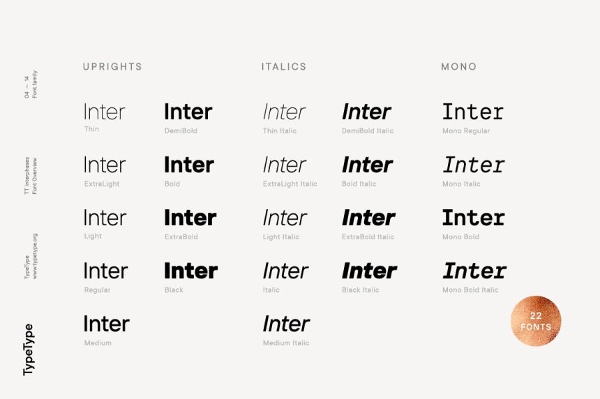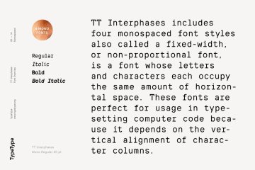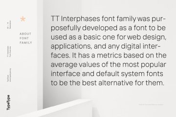 您可以通过链接了解文章中字体创建的详细历史,在这里我们将告诉您我们到底得到了什么。TT Interfaces 包含 24 种样式:基本系列中的 18 种样式、4 种等宽字体和 2 种可变字体。TT Interphases 的主要视觉特征包括字符的大光圈、黑白均匀分布以及出色的可读性。字体图案的一般中性并非没有优雅,字体的所有细节都是用数学的精确和爱来制作的。此外,TT Interphases 拥有最先进的手动 TrueType 提示。