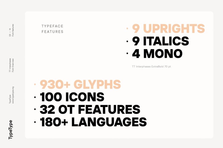 基本的 TT Interphases 系列由 18 种样式(9 种粗细和 9 种斜线)组成,每一种都有超过 930 多个字形。在字体中,您可以找到老式图形、风格替代品、数学符号,以及分为五个主题组的 100 个通用图标:基本操作、状态、网站部分、文档和文件夹、移动界面。TT Interphases 支持 180 多种基于扩展拉丁语和西里尔语的语言,包括保加利亚语本地化。特别是对于那些投入到这个主题的人,我们制作了两种可变字体(罗马和斜体),它们的符号组成完全遵循基本设置。
