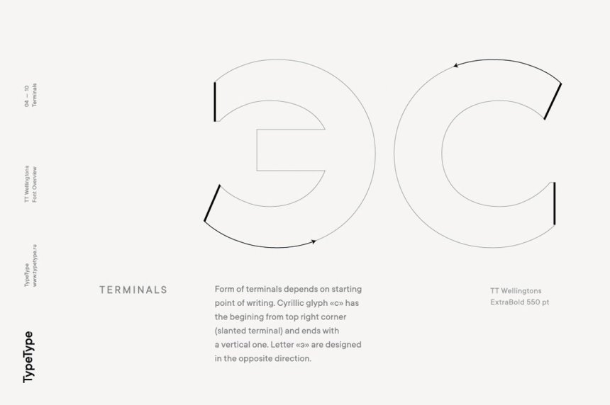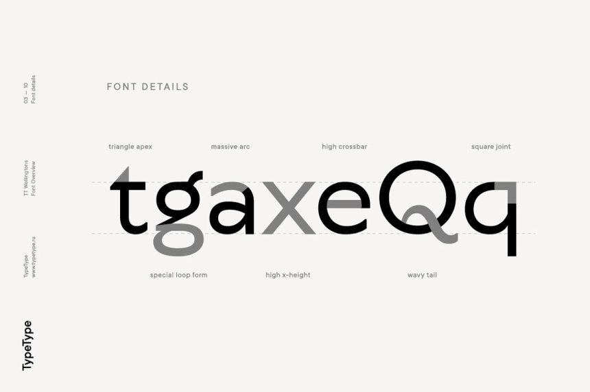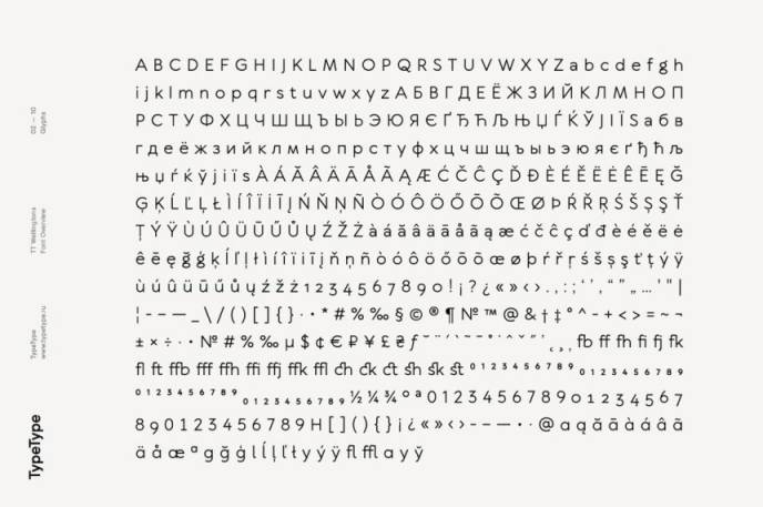 人们可以在 TT Wellingtons 找到许多典型的海报笔在纸上移动的传统技术的人工制品。这些是字母“C”或“Э”的上下角的不对称部分或笔划连接的平滑元素,在小写拉丁字符中清晰可见,例如在字母“n”中。小写字符高度的大尺寸和圆形构造的几何方式——它们在TT Wellingtons中是枕形的——可以归类为现代字体的特点。除了上面列出的所有内容外,该字体还具有一组样式替代项,可将样式形成字符的形状更改为纯几何形状。