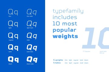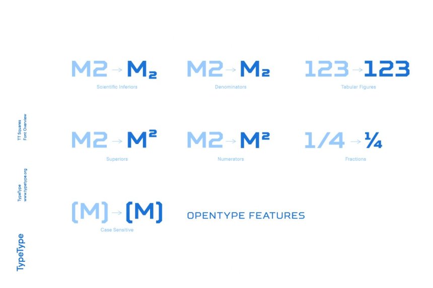 独家字体家族风格:八角与简约并存。为信息图表和统计数据创建的 TT Squares。这种字体兼具未来感和军事属性。最受欢迎的字体公式:细、轻、常规、粗体、黑色和斜体。TT Squares 是短铭文和长文本块的理想选择。