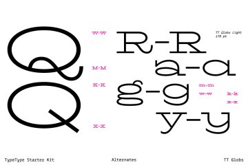 此外,TT Globs 的突出之处在于其非常宽的字母比例、高大的小写字符以及长的上升和下降。为了混合僵硬的字体节奏,我们在一些字母中创建了不对称的波浪状终端和流动元素。具体来说,在这方面可以提到字母 GSQRasgec 的流动形状——它们吸引注意力,甚至可以作为标识中的重要元素。