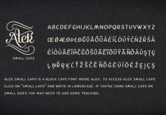 将阿列克和阿列克饰品结合起来,完成您的设计。打开SmallCaps并以小写字母写入以激活一组旨在支持Alek的块字母。