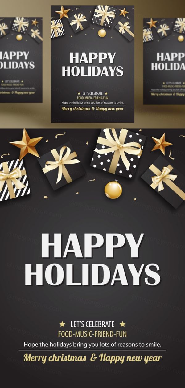 图穷联素材库 » 年黑金圣诞节新年快乐矢量插图海报素材 Happy Holiday