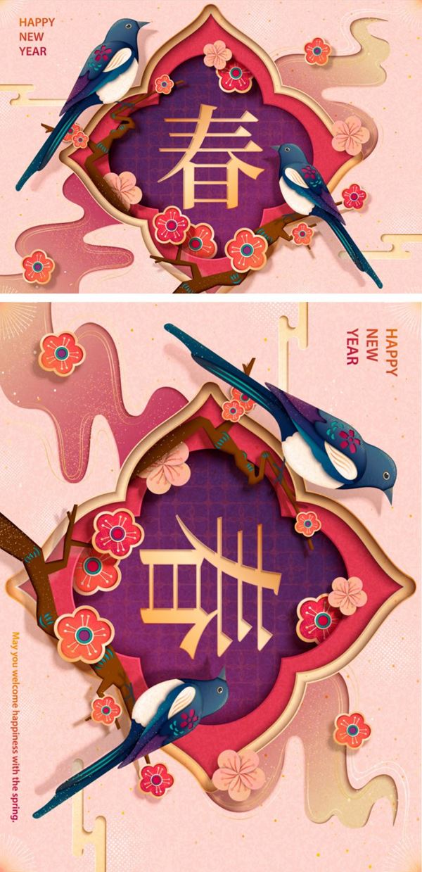 图穷联素材库 » 年梅花喜鹊纸艺术风格中国新年年画矢量海报素材