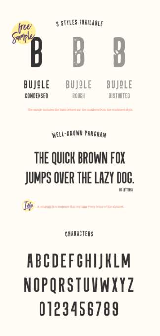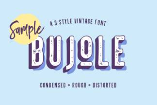 Bujole 是一款复古风格的字体,有3种不同的款式:Condensed,Rough和Distorted。使用此字体可以创建徽标,徽章,标签,包装设计,标题,广告或在您的下一个设计项目中使用它。