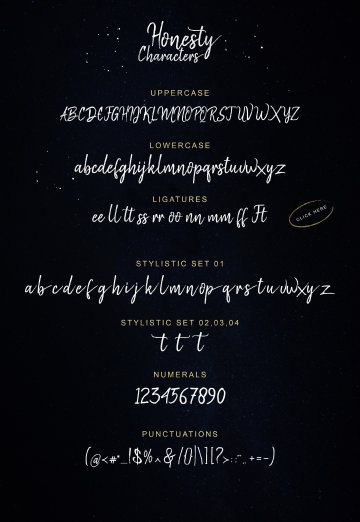 诚实脚本总共有227个字形。替代字符分为几种Open Type特征,如Swash,Stylistic Sets,Stylistic Alternates,Contextual Alternates和ligature。可以使用Open Illust精明程序访问Open Type功能,例如Adobe Illustrator,Adobe InDesign,Adobe Photoshop Corel Draw X版本和Microsoft Word。这已经给出了PUA Unicode字体(特殊编码字体)。这样所有的替代角色都可以由工匠或设计师轻松访问