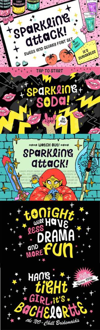 我一直是游戏,卡通,幻想世界和复古情绪的忠实粉丝。80-90岁的霓虹炫彩配色方案,有趣和俏皮的游戏文化以及墨水漫画书激发了我创造这种SPARKLING ATTACK字体。这种字体有自己的个性,有趣,古怪,仍然如此甜美。