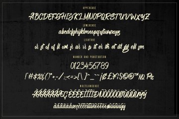Bellsmore画笔脚本是一种包含更多替代和一些swashess的字体。这种字体旨在相互补充使用。Bellsmore笔刷脚本非常适合徽标设计,T恤,传单,服装,包装,广告,婚礼邀请等。此字体包含大写,小写,替代,数字,符号,标点符号,连字和奖金花饰。还支持多语言和已经PUA编码。
