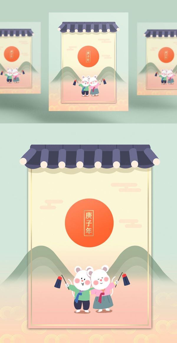 韩式年山水卡通可爱风格鼠年海报模板