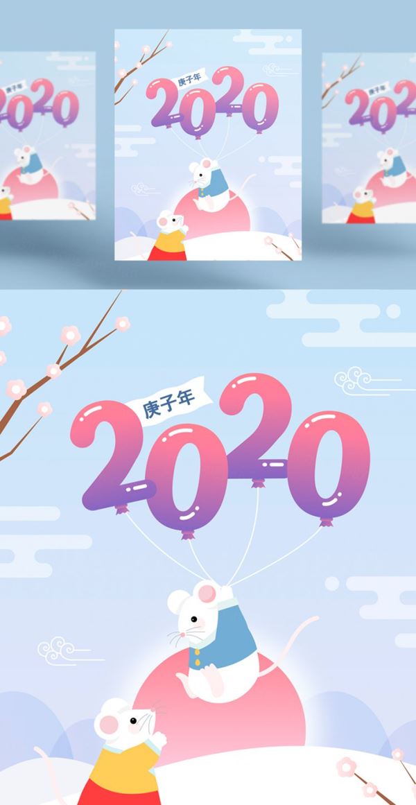 春节新年韩式年卡通气球雪地鼠年海报模板