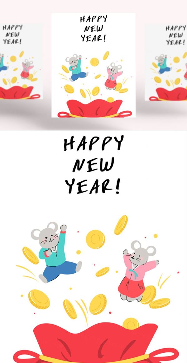 金币喷发的韩式年卡通可爱的鼠年海报模板