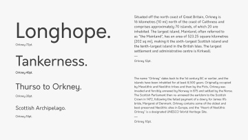 奥克尼是塞缪尔·奥克斯和阿尔弗雷多·马尔科·普拉迪尔设计并概念化的几何字体。创建这种字体的目的是要有一种独特而实用的字体,可以用于印刷或屏幕上的各种项目。