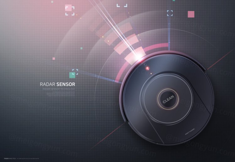 图穷联素材库 » 扫地机器人吸尘器高新科技雷达扫描传感器技术概念宣传海报PSD模板 Radar Sensor