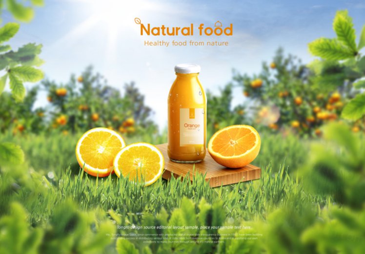 图穷联素材库 » “大自然的馈赠”农场天然橘子橙汁有机饮料包装宣传海报广告设计PSD模板