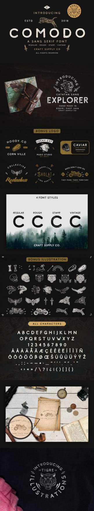 破旧粗糙复古的英文字体 Comodo Font Family + Illustrations
