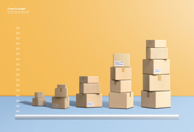 图穷联素材库 » 三维渲染快递包裹航运物流贸易纸箱创意柱形图数据图表PSD商业合成海报模板素材
