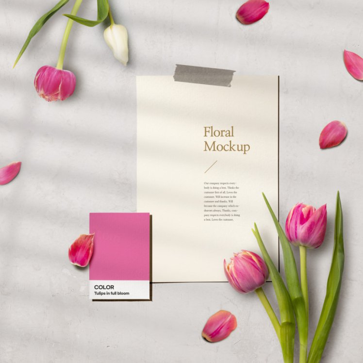 图穷联素材库 » 春天春季花朵花瓣植物树叶郁金香花卉场景纸张装饰样机PSD海报模板