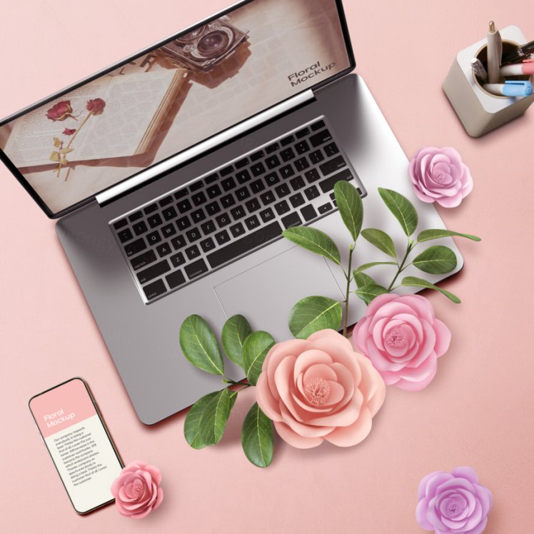 图穷联素材库 » 春天春季花朵花瓣植物树叶花卉场景笔记本电脑装饰样机PSD海报模板