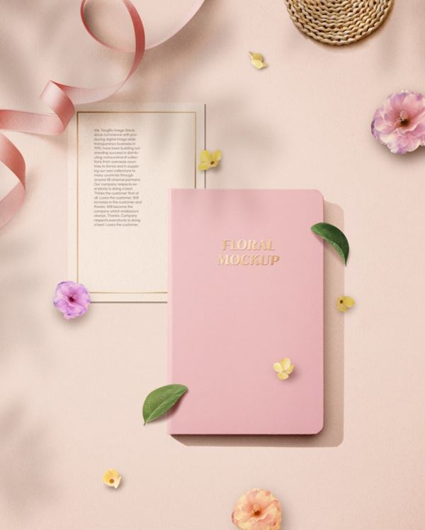 图穷联素材库 » 粉色春天春季花朵花瓣丝带树叶花卉场景笔记本记事本装饰样机PSD海报模板