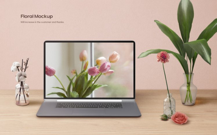 图穷联素材库 » 春天春季花朵花瓣郁金香花卉场景笔记本装饰样机PSD海报模板