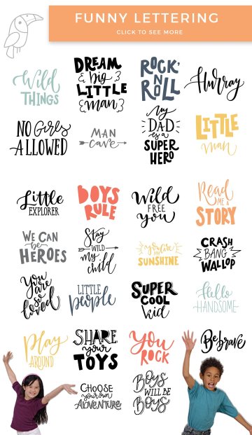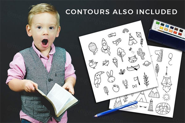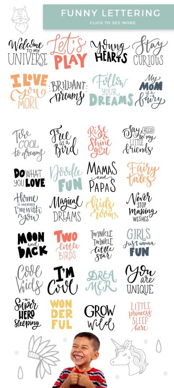 超过150种矢量和光栅元素:动物角色,鸟类,山脉,树木和植物,花卉,运输等等,适用于男孩和女孩(包括所有轮廓)。58时尚刻字海报和印刷精彩。您还将获得10个无缝模式和20个预制海报。