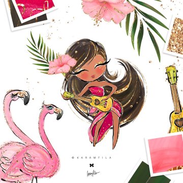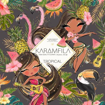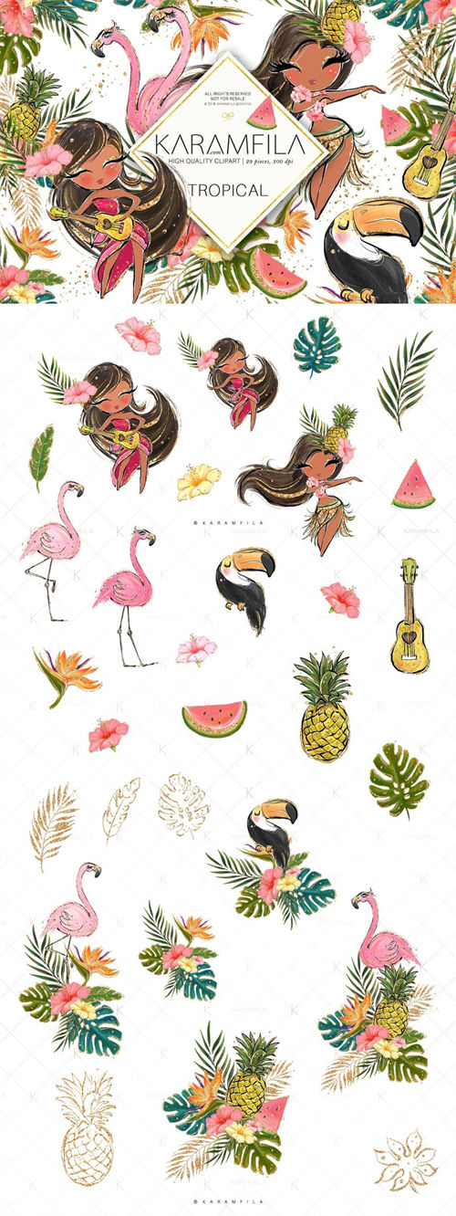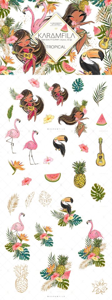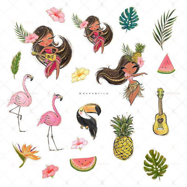 热带剪贴画闪光火烈鸟剪贴画草裙舞女孩夏威夷阿罗哈剪贴画西瓜菠萝剪贴画尤克里里岛巨嘴鸟夏季计划表贴。