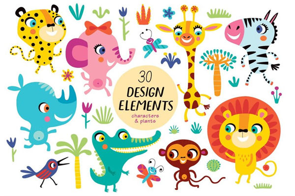 30个图形元素(11种动物,19种植物) - 1个矢量文件(10 EPS)+ 1个光栅图像(JPG)+ 30个文件(PNG)