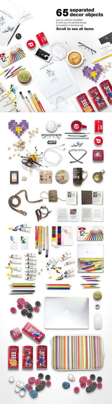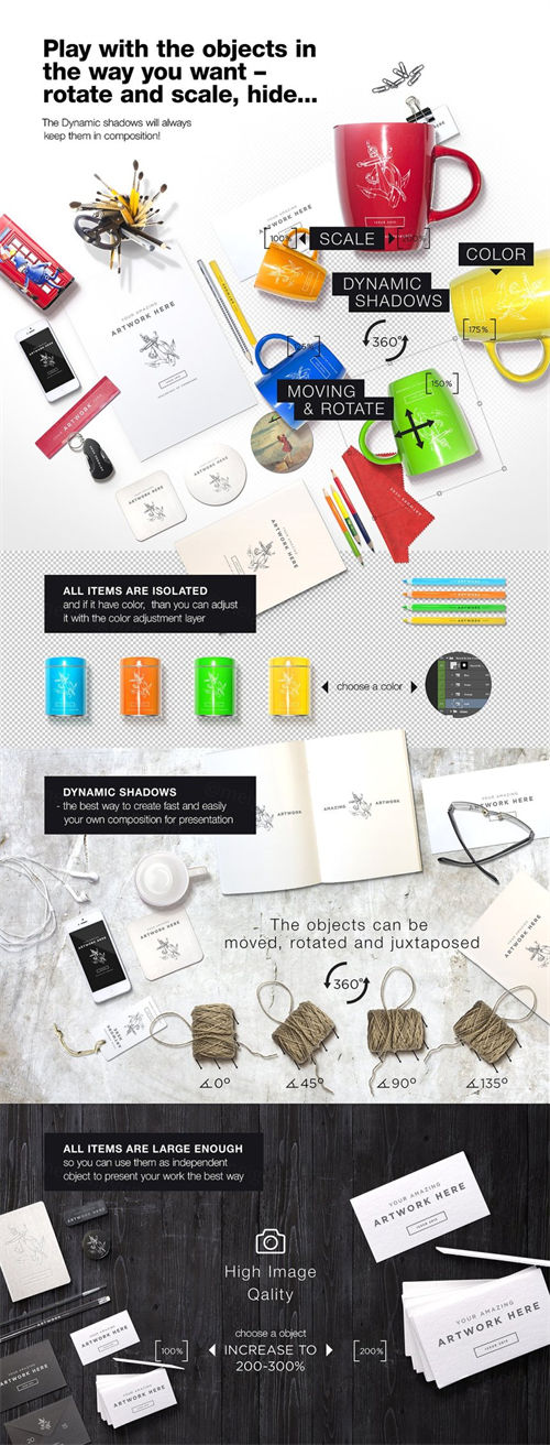 创建您自己的CUSTOM SCENE CONSTRUCTOR Mock Up组合或使用我们的“场景生成器” 使用现成的20场景。所有项目都有动态阴影,因此您可以移动,旋转,缩放任何项目,并获得与光效相同的最佳效果。这些文件具有高分辨率,因此您可以根据需要制作小型或大型场景。