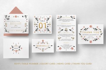 您的套餐包括:婚礼邀请,保存日期,回复,表号,护送卡,菜单卡和感谢卡给您的客人; 每个细节都很容易编辑。至于PSD,图层排列整齐,颜色突出,您可以自己定制或自己创建一张新卡!