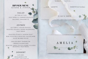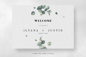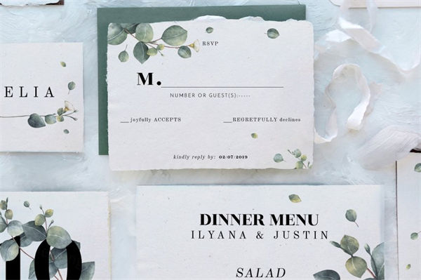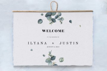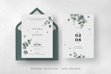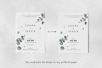 精致优雅的婚礼邀请设计,融合了桉树插图和现代布局,适合您的婚礼庆典!