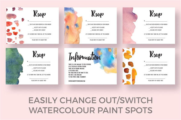 Artsy Wedding Invitation Collection包括:Wedding Invitation(8),RSVP(5),Information card,Save the Date,Menu和Thank You模板。