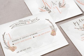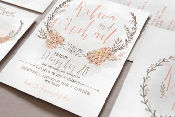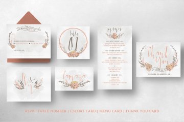 你有什么包括:婚礼邀请,保存日期,回复,表号,护送卡,菜单卡和感谢卡为您的客人。每个细节都很容易编辑,甚至花卉和蕨类植物(绣球花插图除外)因为它们是形状层。